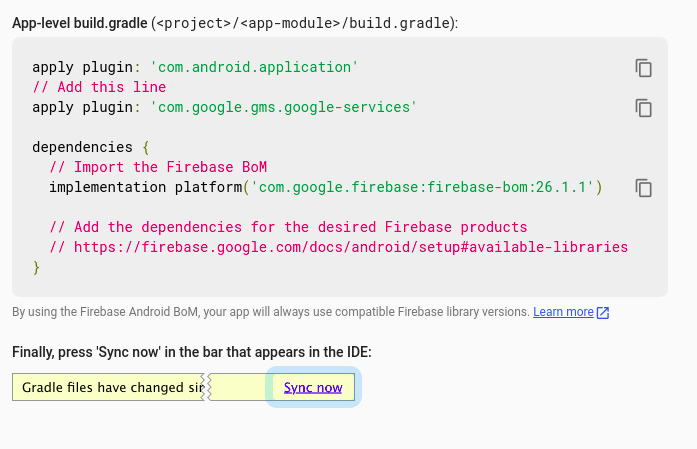 1. Add Firebase SDK by copying and pasting the snippets in the App-level build.gradle file.