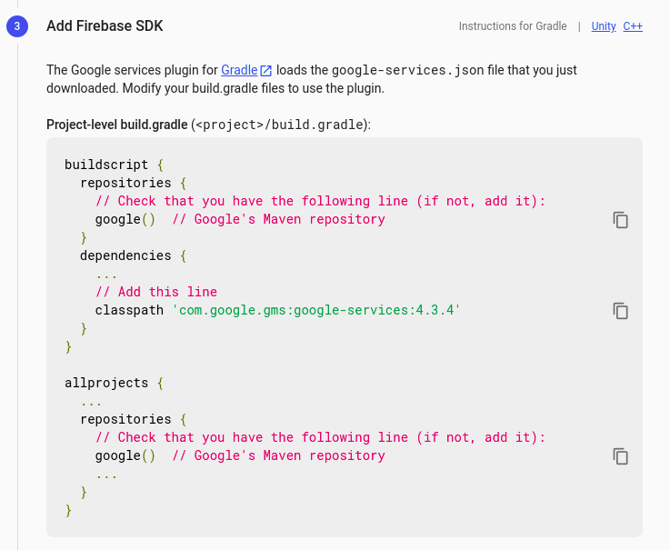 1. Add Firebase SDK by copying and pasting the snippets in the Project-level build.gradle file.