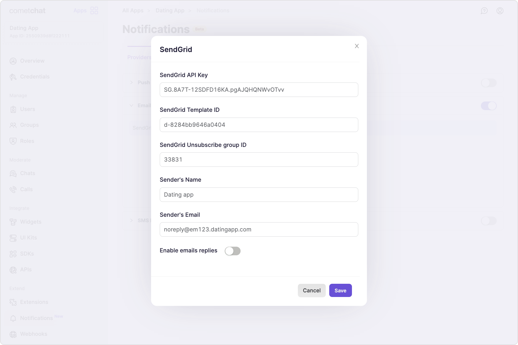 - Enabling the “Trigger only if email address is stored with CometChat” setting requires users’ email addresses to be stored with CometChat using the Update Contact details API. When enabled, the webhook is triggered only for those users. If this setting is disabled, the webhook triggers regardless of whether users’ email addresses are stored with CometChat.