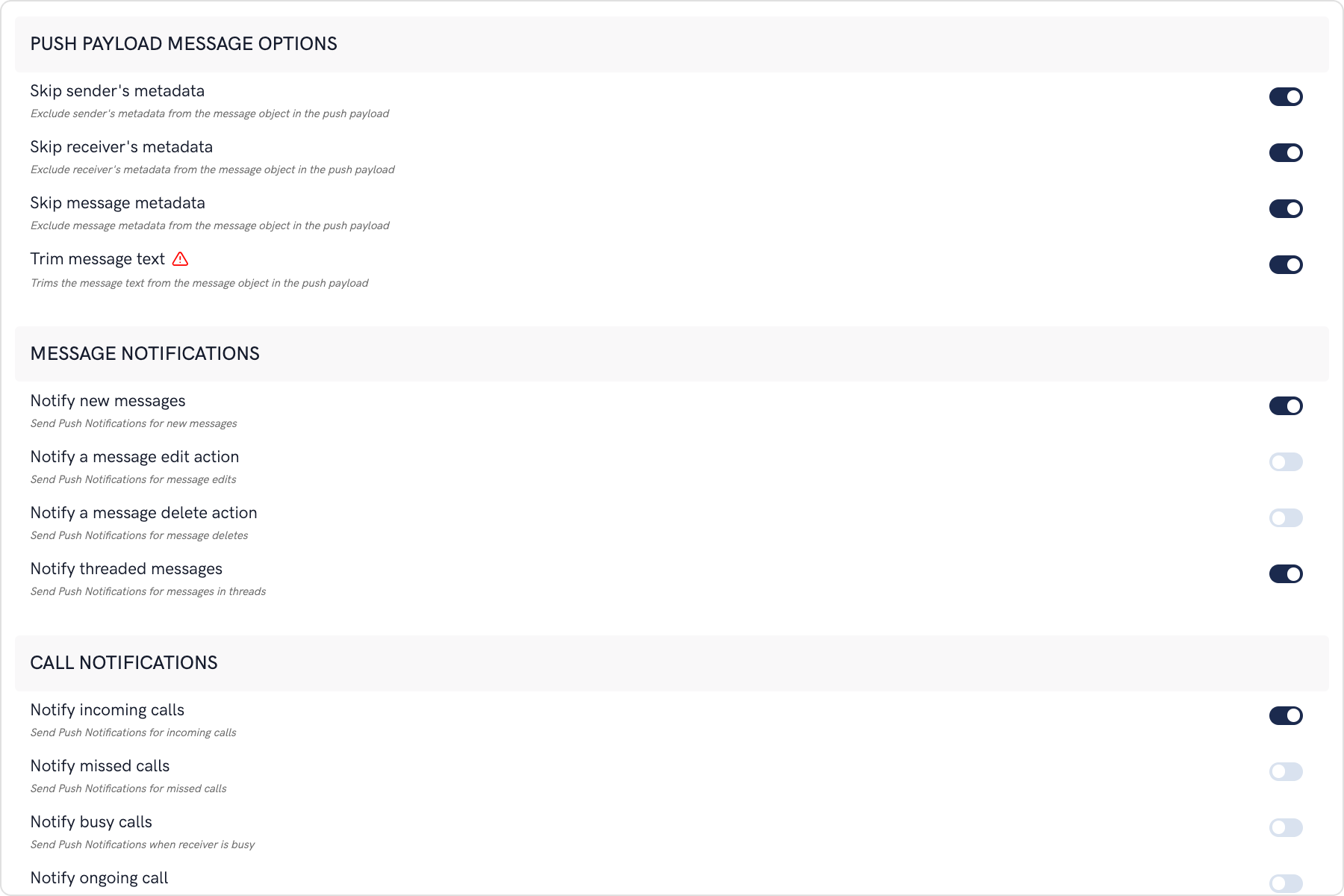 - Notification payload settings