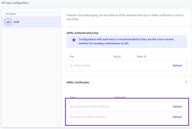 Cloud Messagingtab. - Scroll down to iOS app configuration, click the Upload button for APNS certificate.