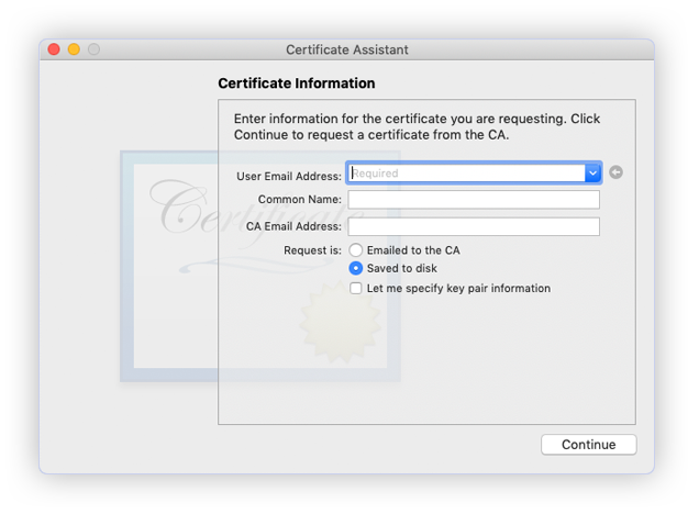 - The Certificate Information dialog box appears. Enter the email address that you use in your Apple Developer account, and enter a common name for your private key. Don’t enter CA email address, choose Saved to disk, and then click the Continue button.