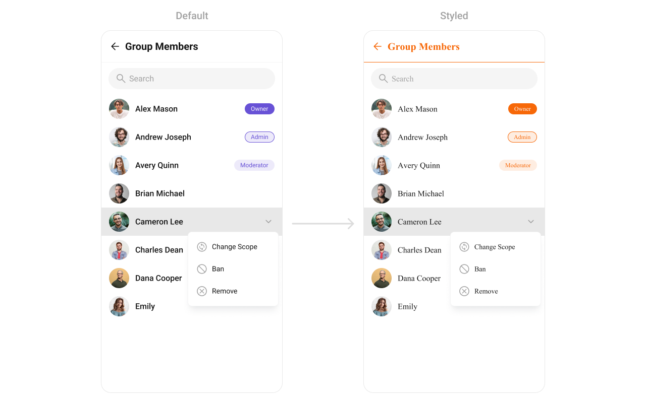 For advanced-level customization, you can set custom views to the component. This lets you tailor each aspect of the component to fit your exact needs and application aesthetics. You can create and define your own views, layouts, and UI elements and then incorporate those into the component. The Group Memebers component does not provide additional functionalities beyond this level of customization.